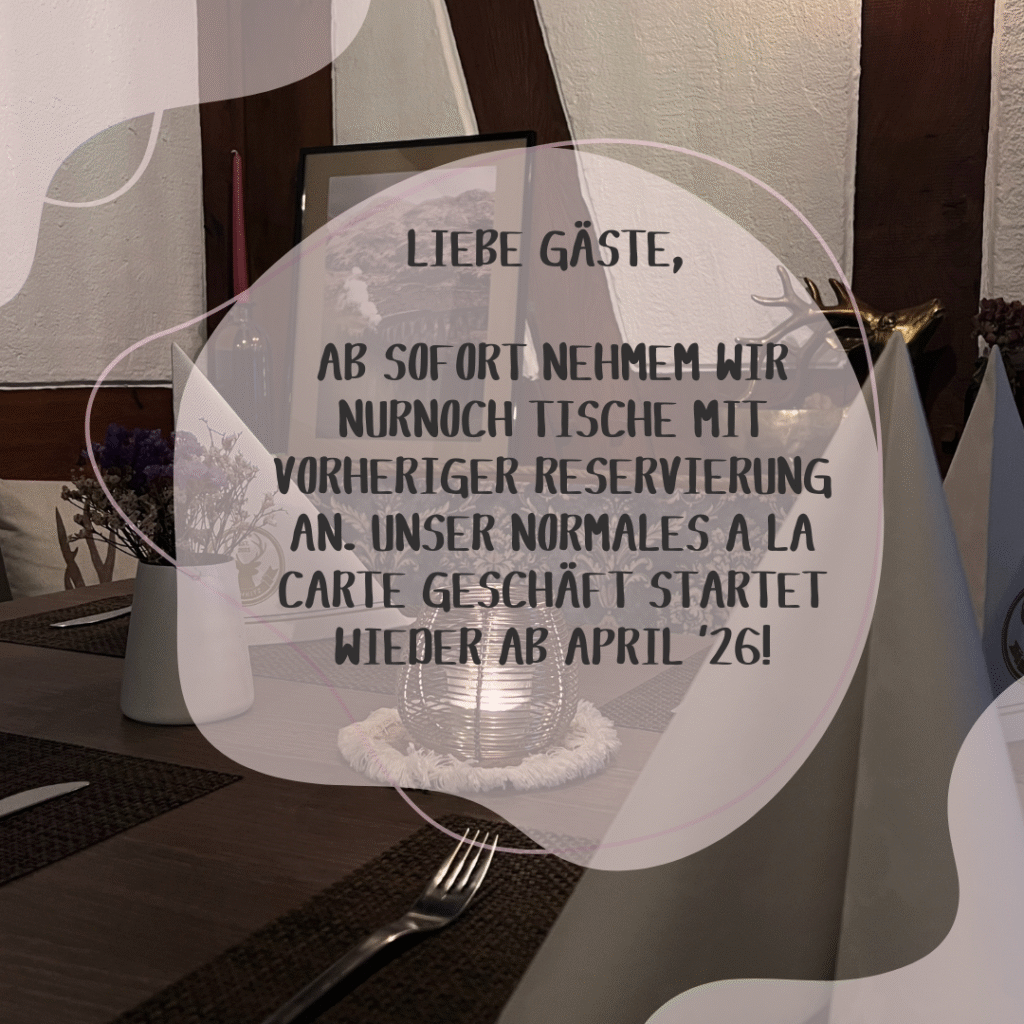 Wir haben Betriebsferien. Vom 23.12.2022 bis zum 05.01.2023 ist nur unser Hotel geöffnet. Ab dem 05.01.2023 sind wir wie gewohnt auch mit der Gastronomie wieder für Sie da.